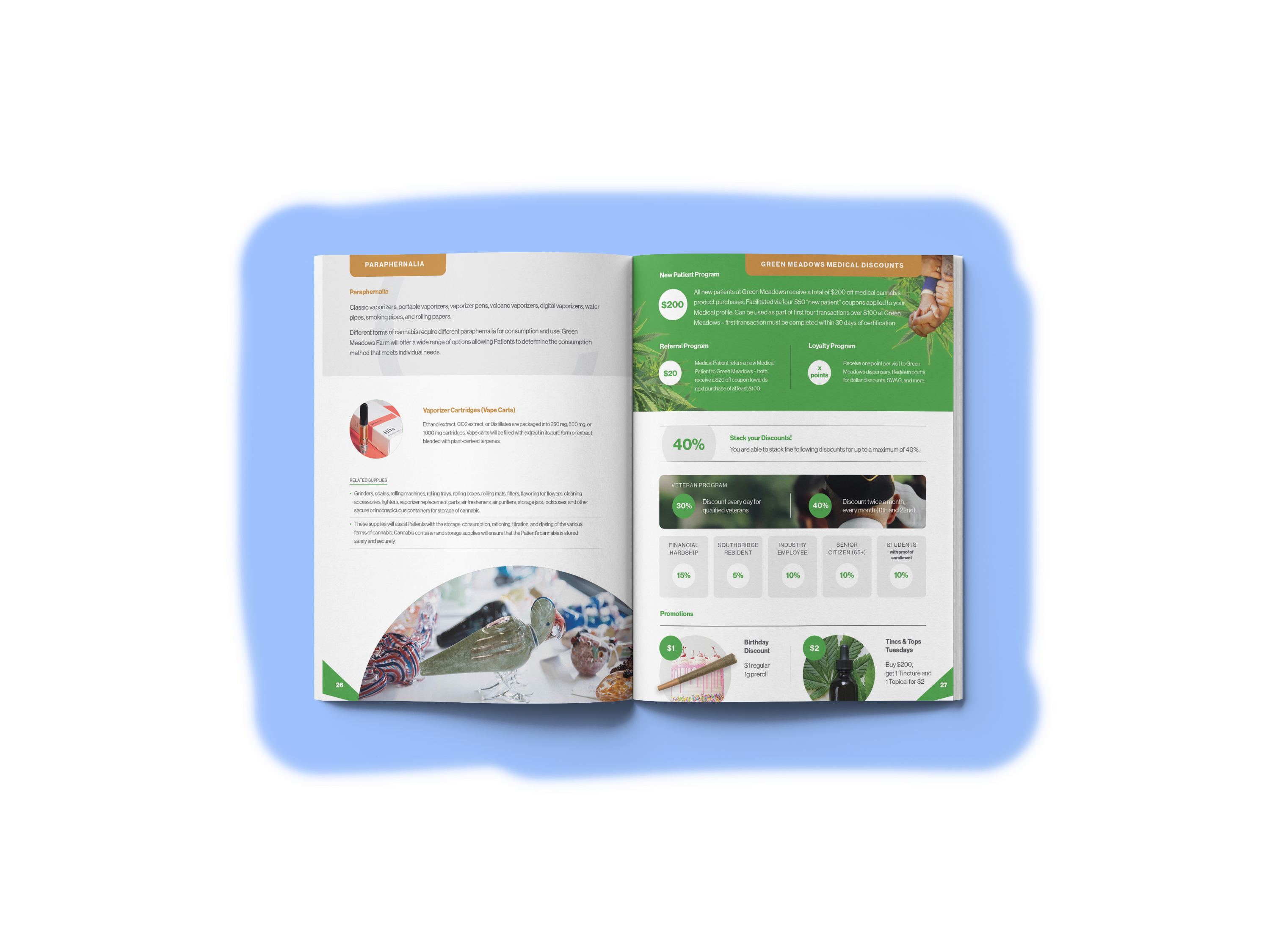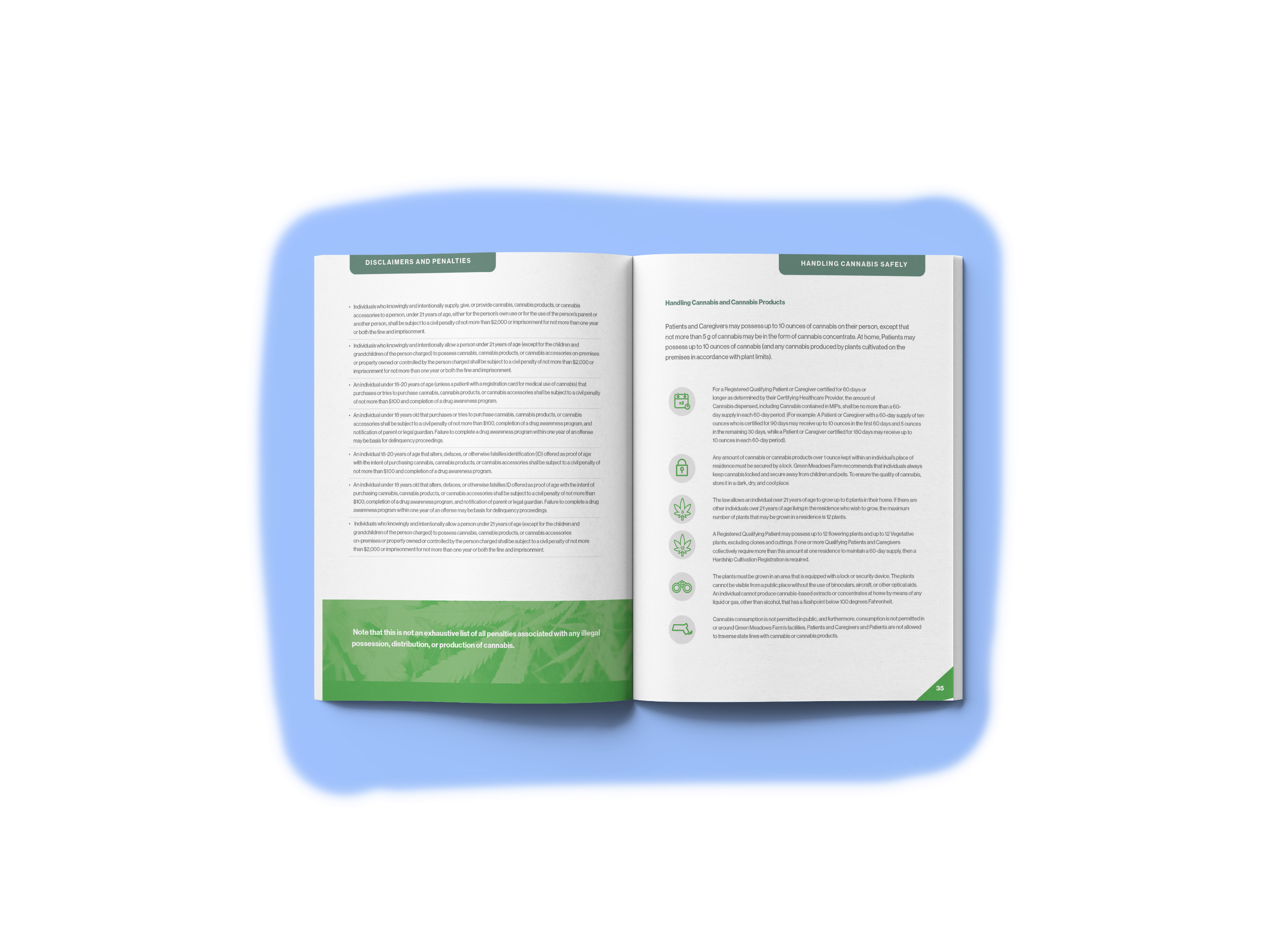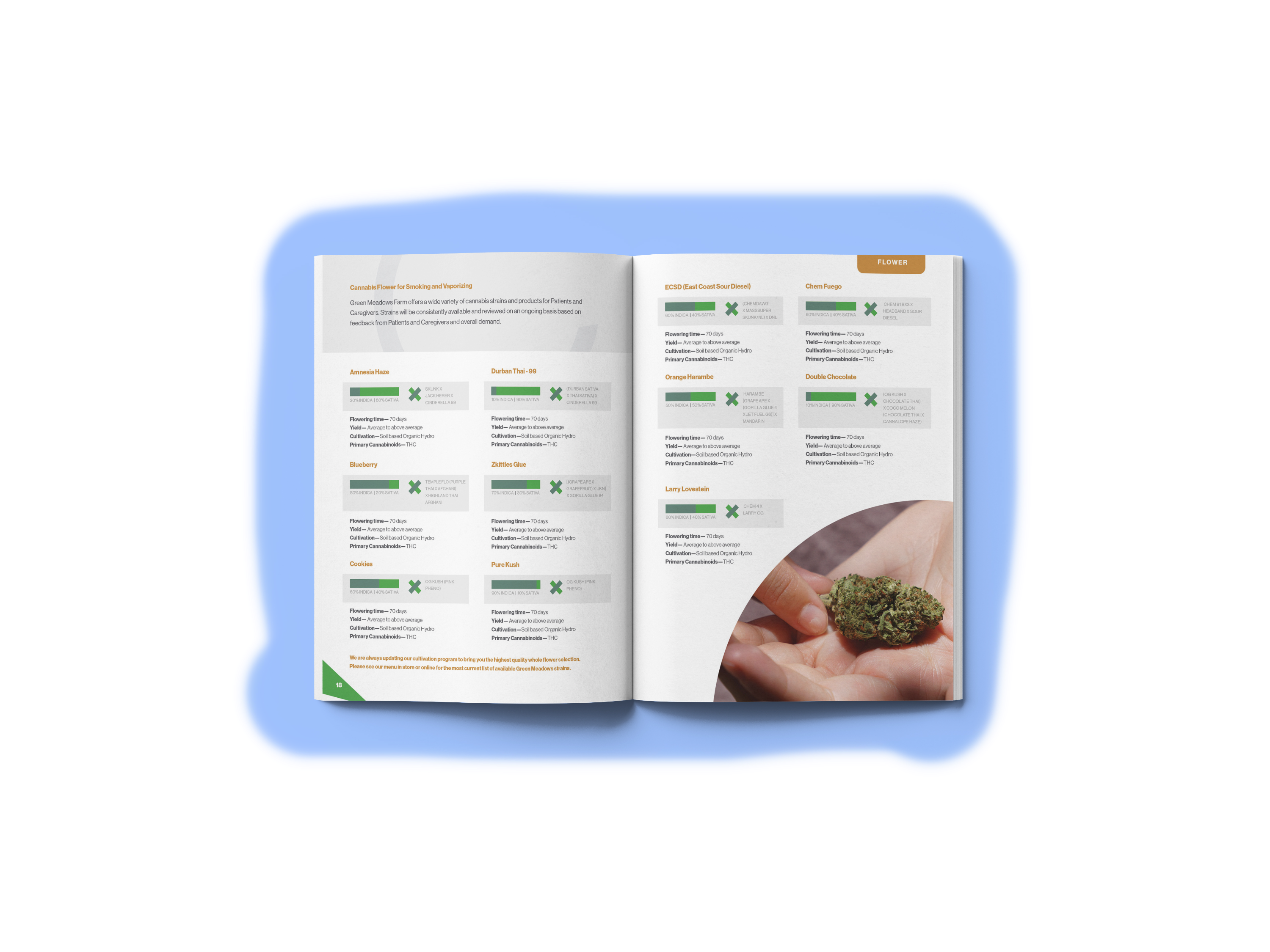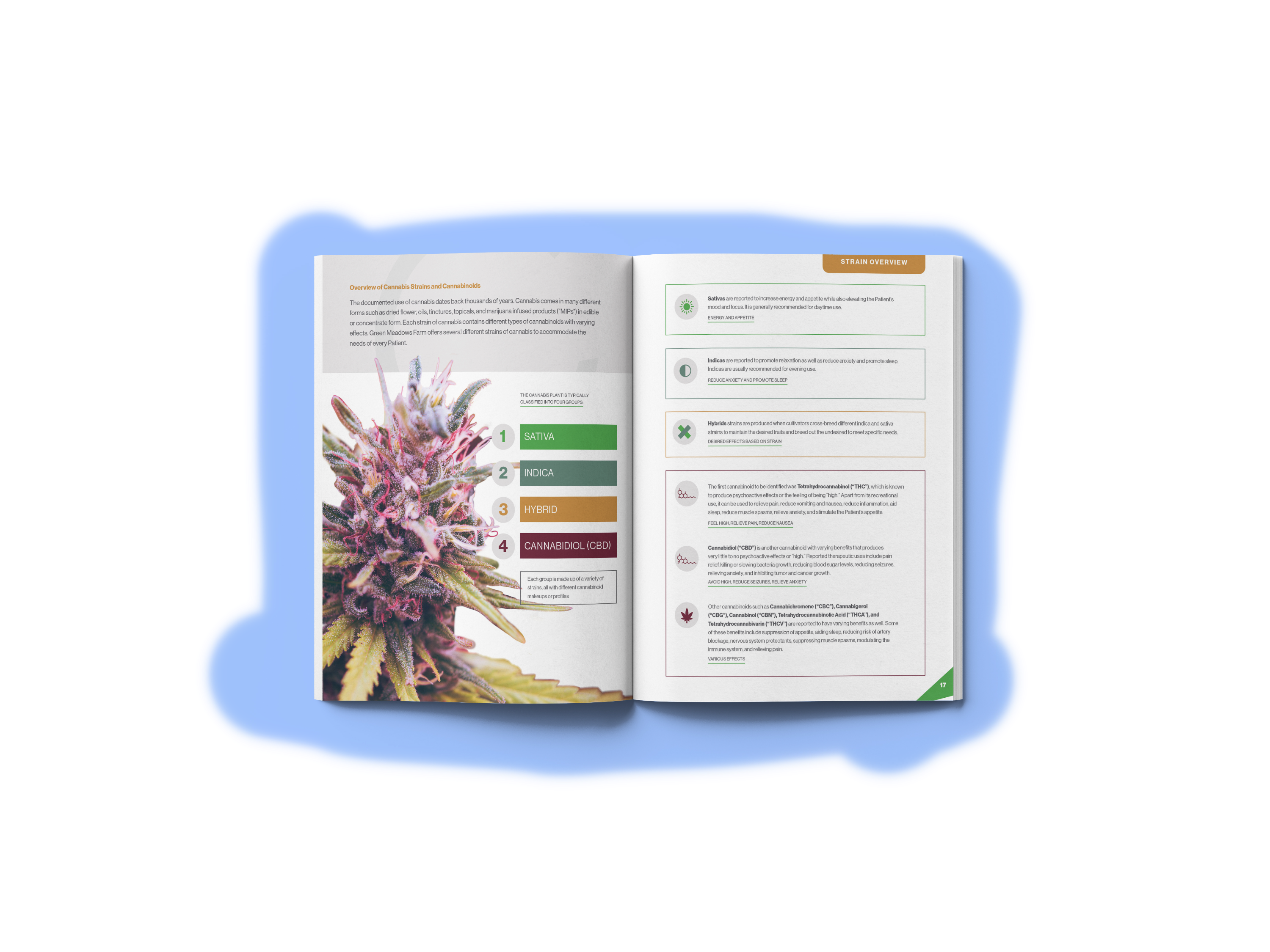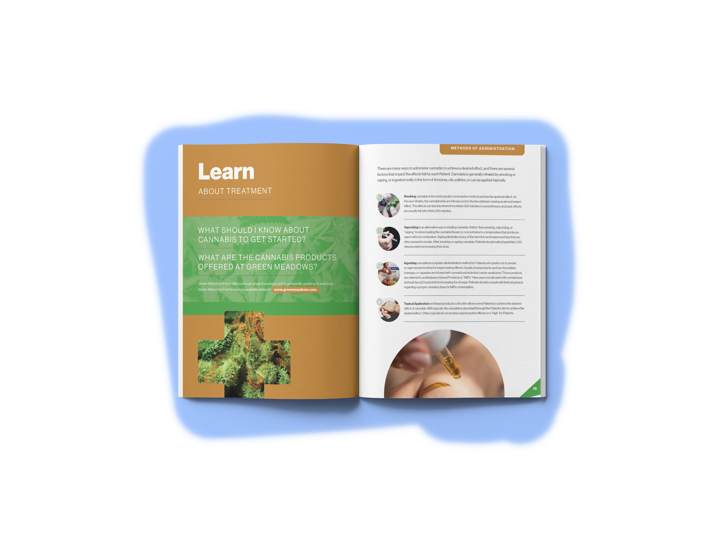 A cornerstone of Green Meadows' mission is to cultivate organic, quality cannabis as an opioid-alternative to PTSD patients. Launching Green Meadows' medical-use program was a top priority that required customer education across social media and printed materials. In particular, the Patient Handbook is a tool to provide to each medical-use patient when they step into Green Meadows seeking relief.