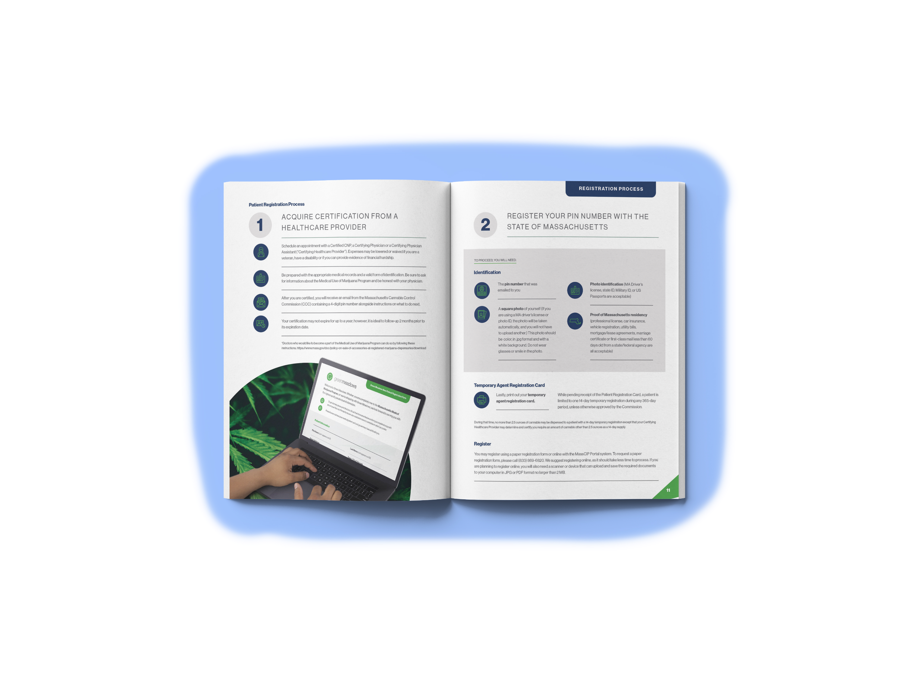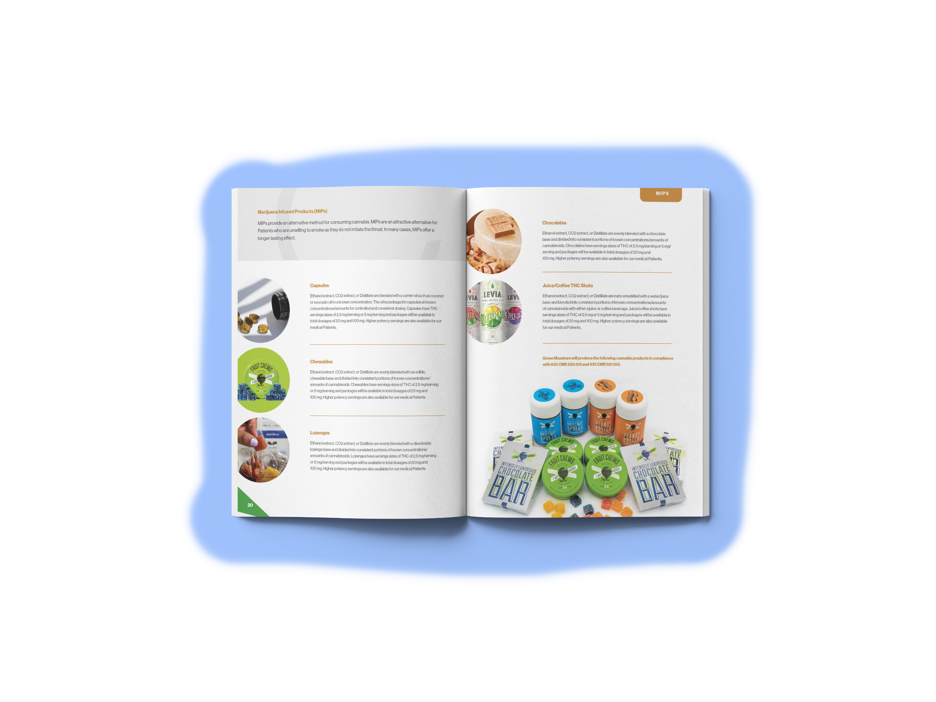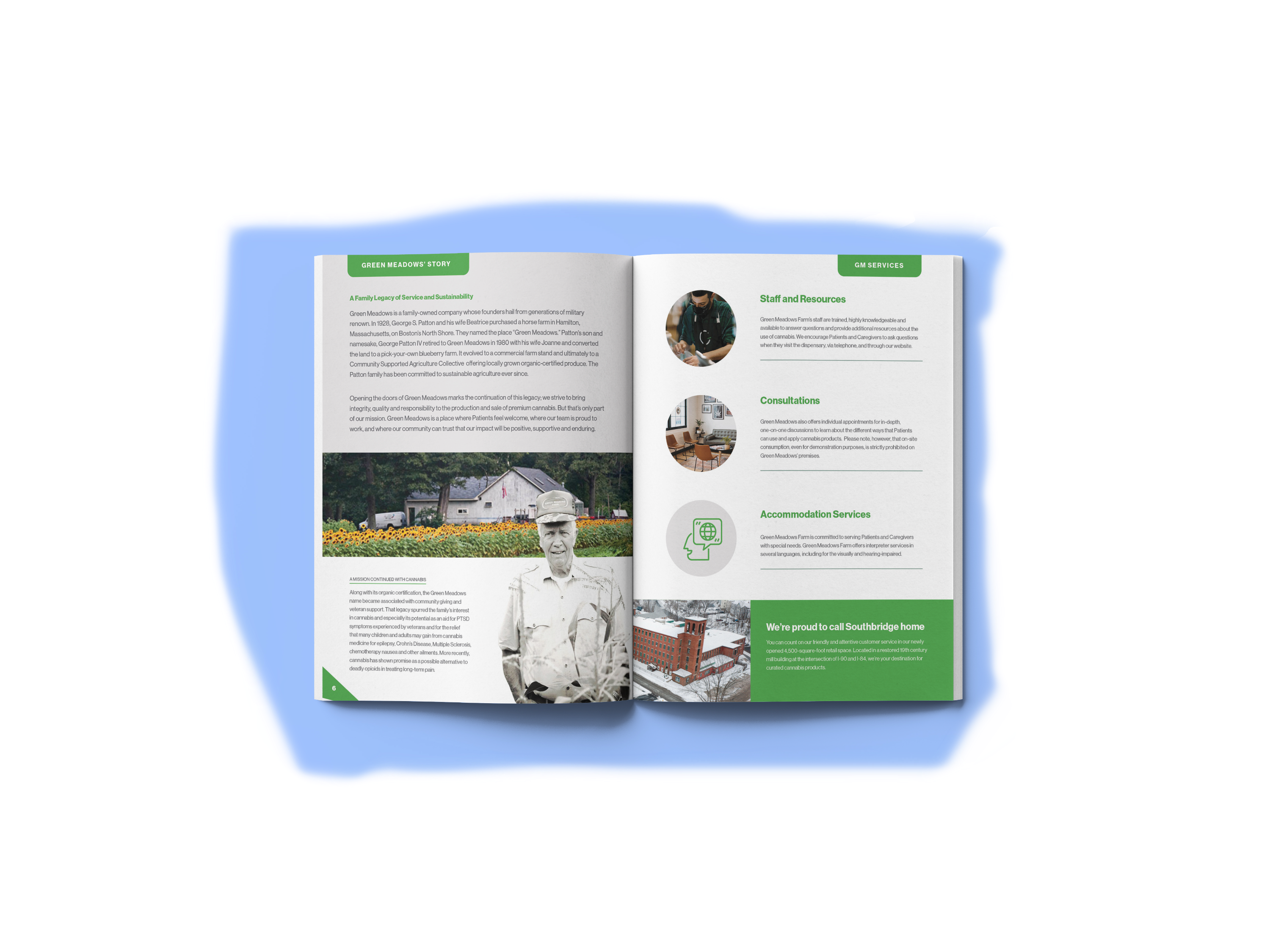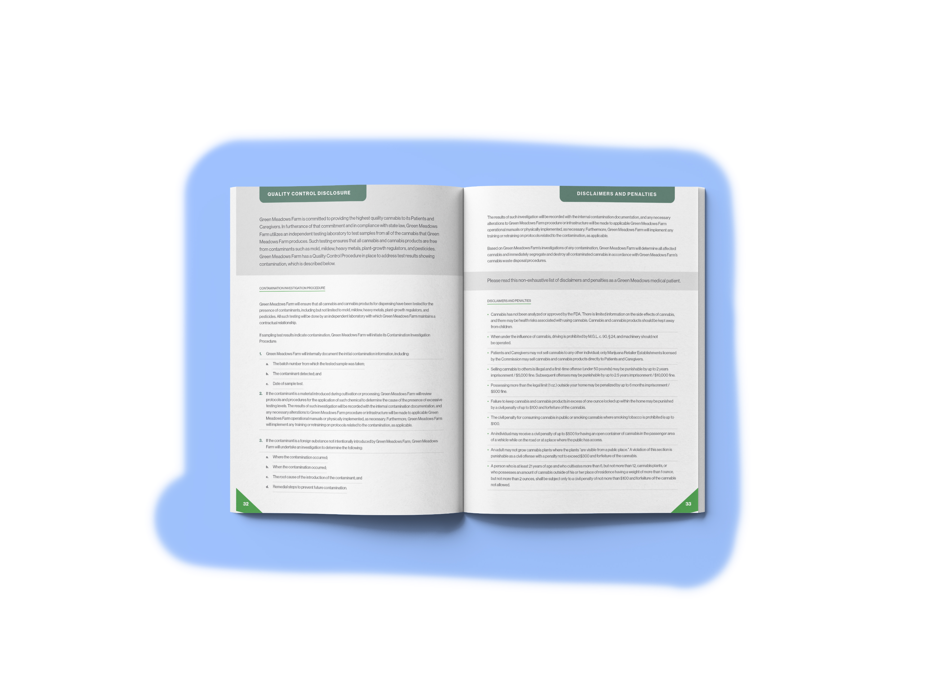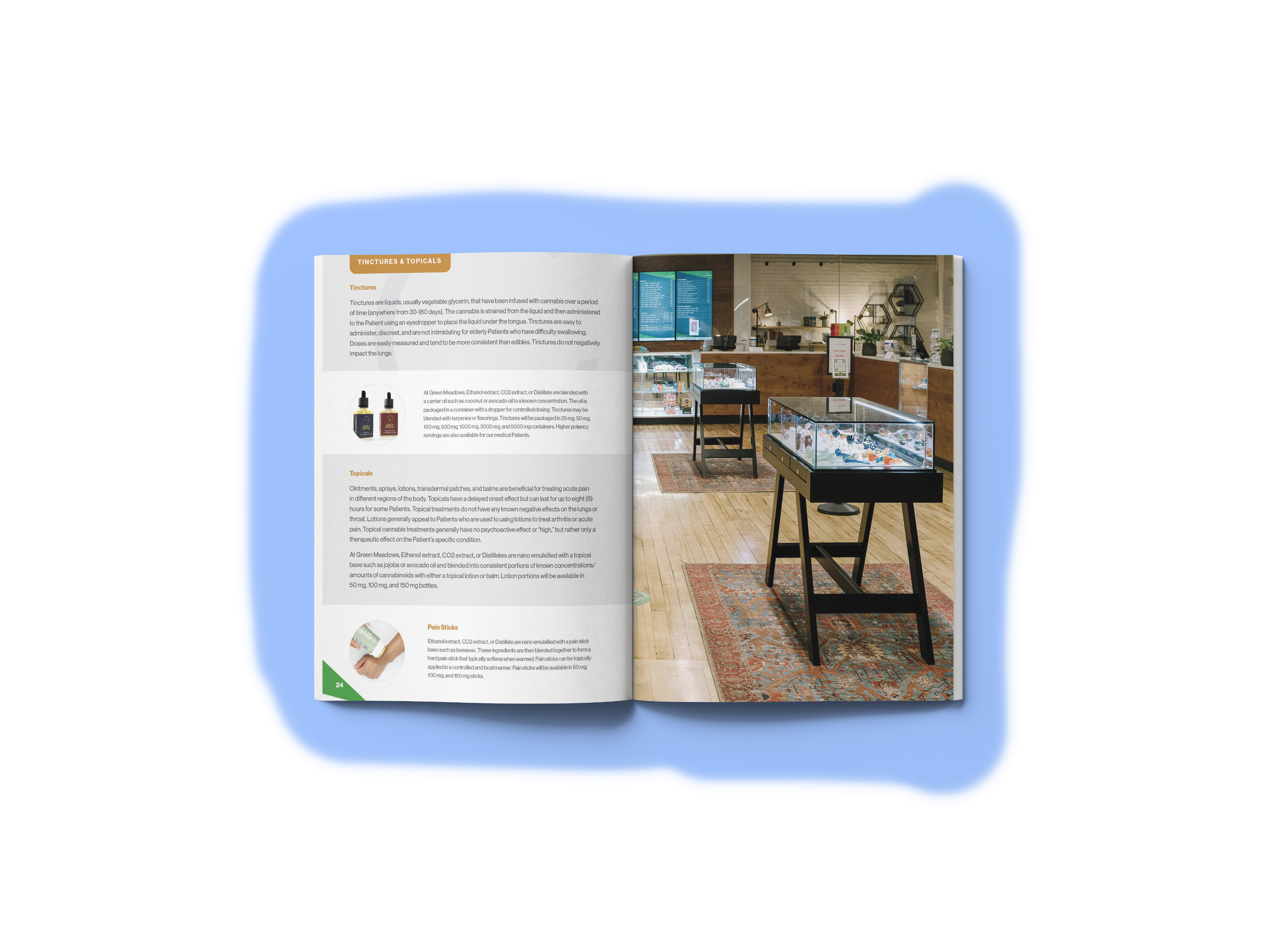 A cornerstone of Green Meadows' mission is to cultivate organic, quality cannabis as an opioid-alternative to PTSD patients. Launching Green Meadows' medical-use program was a top priority that required customer education across social media and printed materials. In particular, the Patient Handbook is a tool to provide to each medical-use patient when they step into Green Meadows seeking relief.